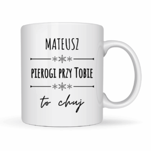 Personalizowany kubek z imieniem i odważnym napisem „Pierogi przy Tobie to ch*j” to idealny pomysł na śmieszny prezent na Święta Bożego Narodzenia! Sprawdzi się doskonale jako upominek dla przyjaciółki, kolegi, chłopaka, dziewczyny lub współpracownika, który ma poczucie humoru i dystans do siebie.