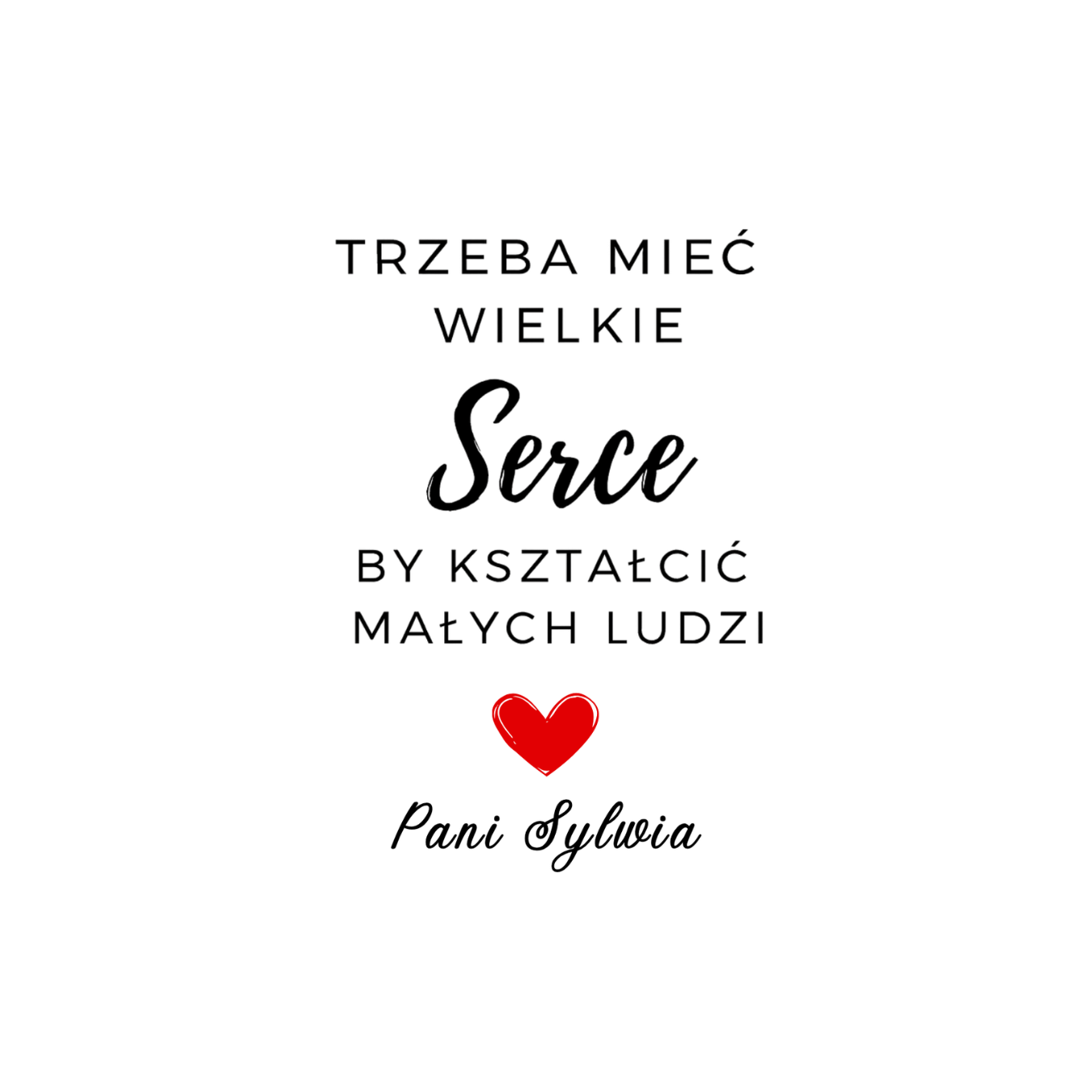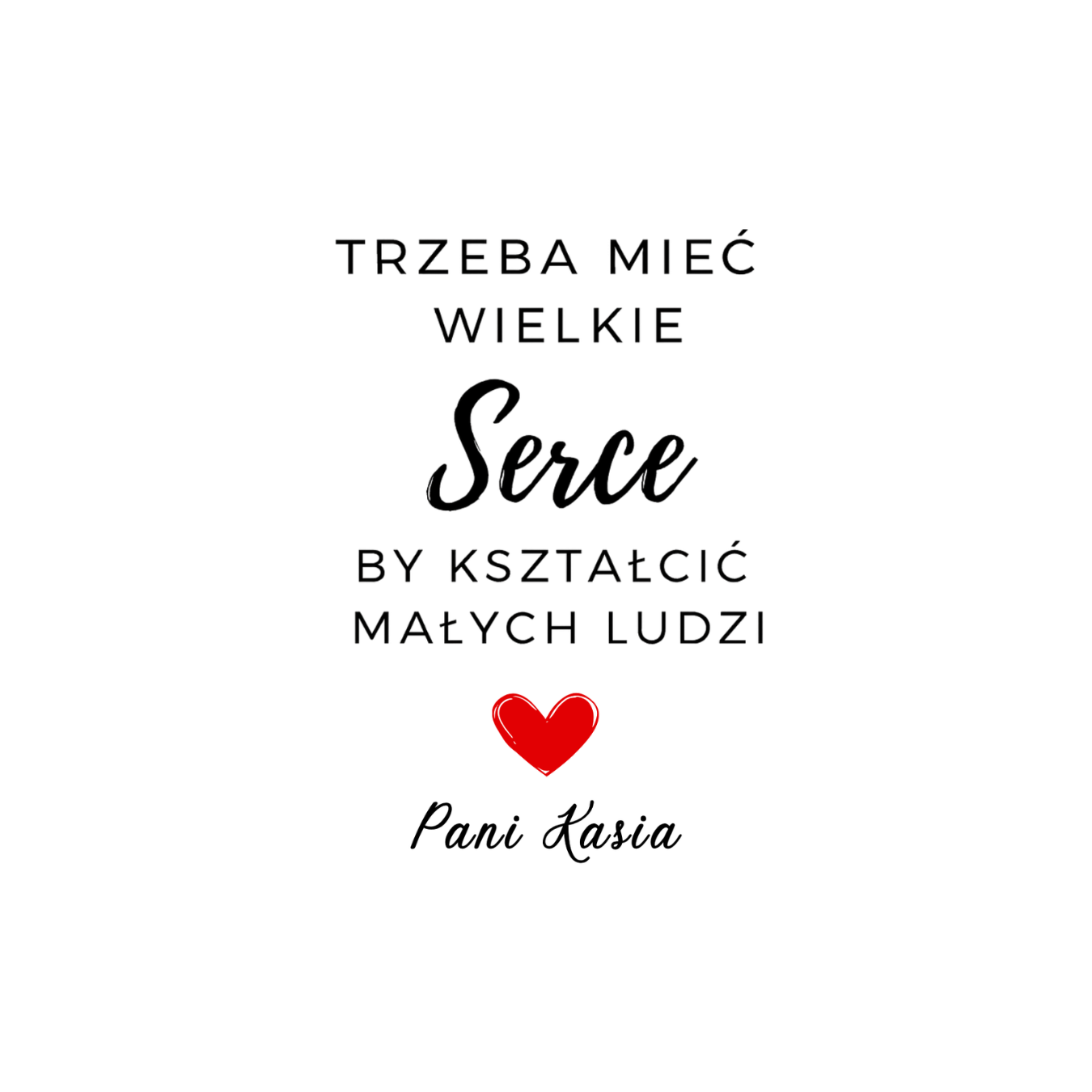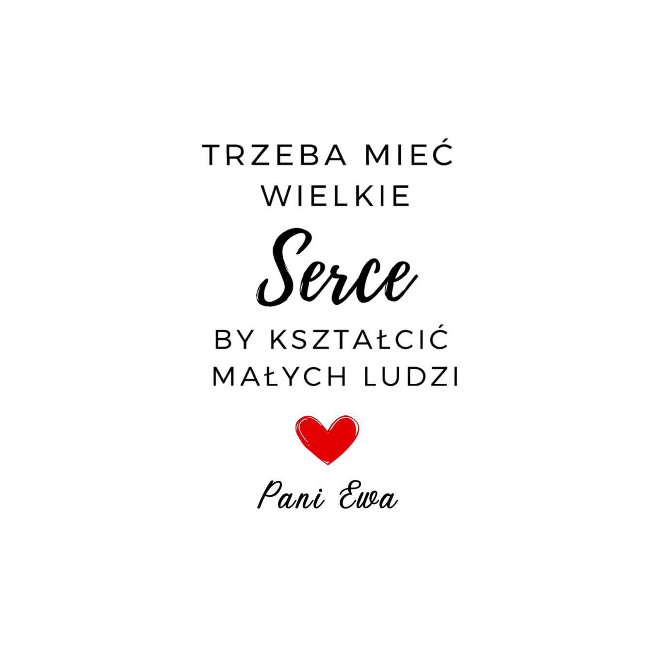 Ten kubek to piękny i wzruszający prezent dla nauczycielki lub wychowawczyni. Napis „Trzeba mieć wielkie serce, by kształcić małych ludzi” idealnie oddaje wdzięczność za trud, cierpliwość i pasję w nauczaniu.